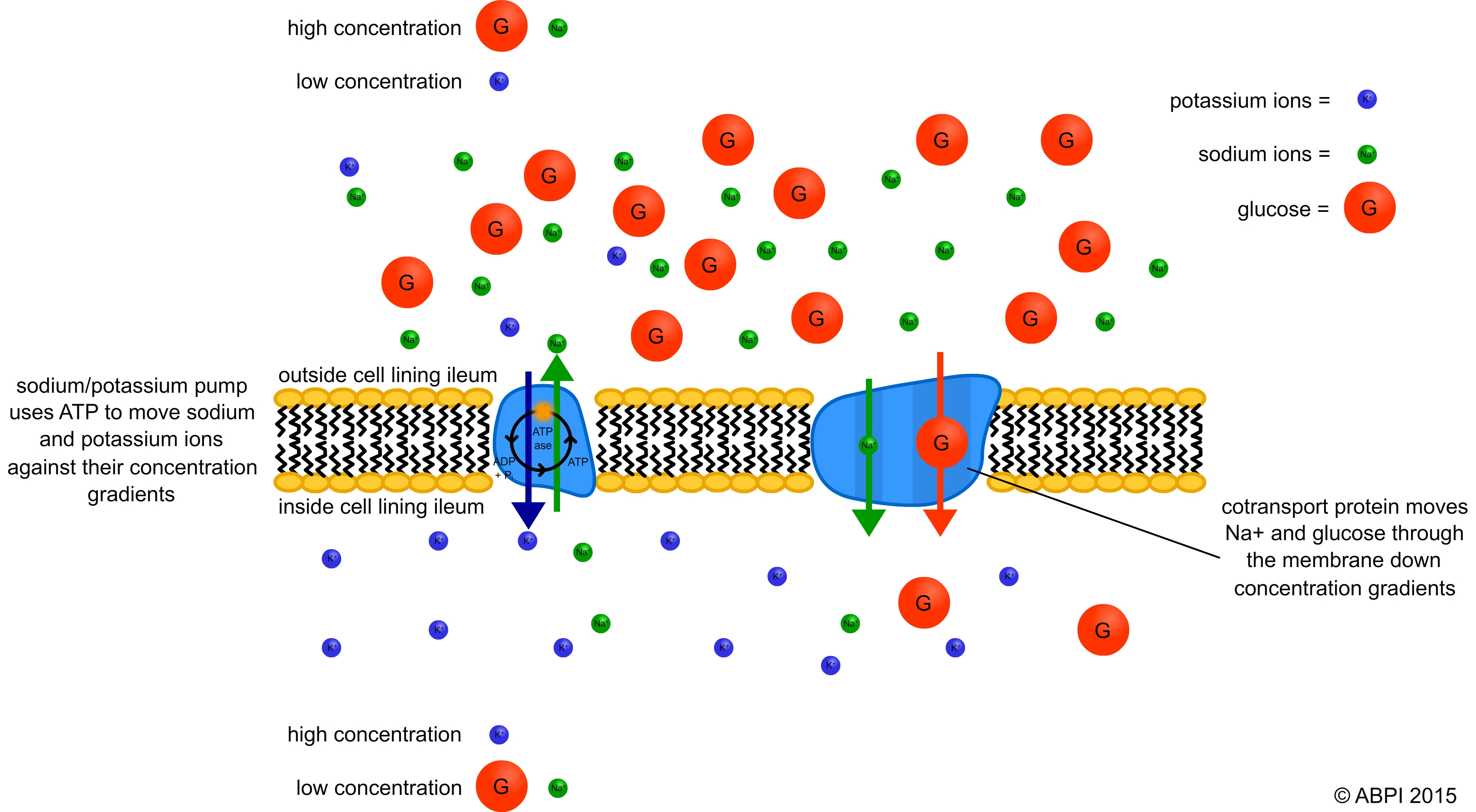For example sodium ions and glucose molecules are moved from the ileum into the cells lining the ileum together down concentration gradients: