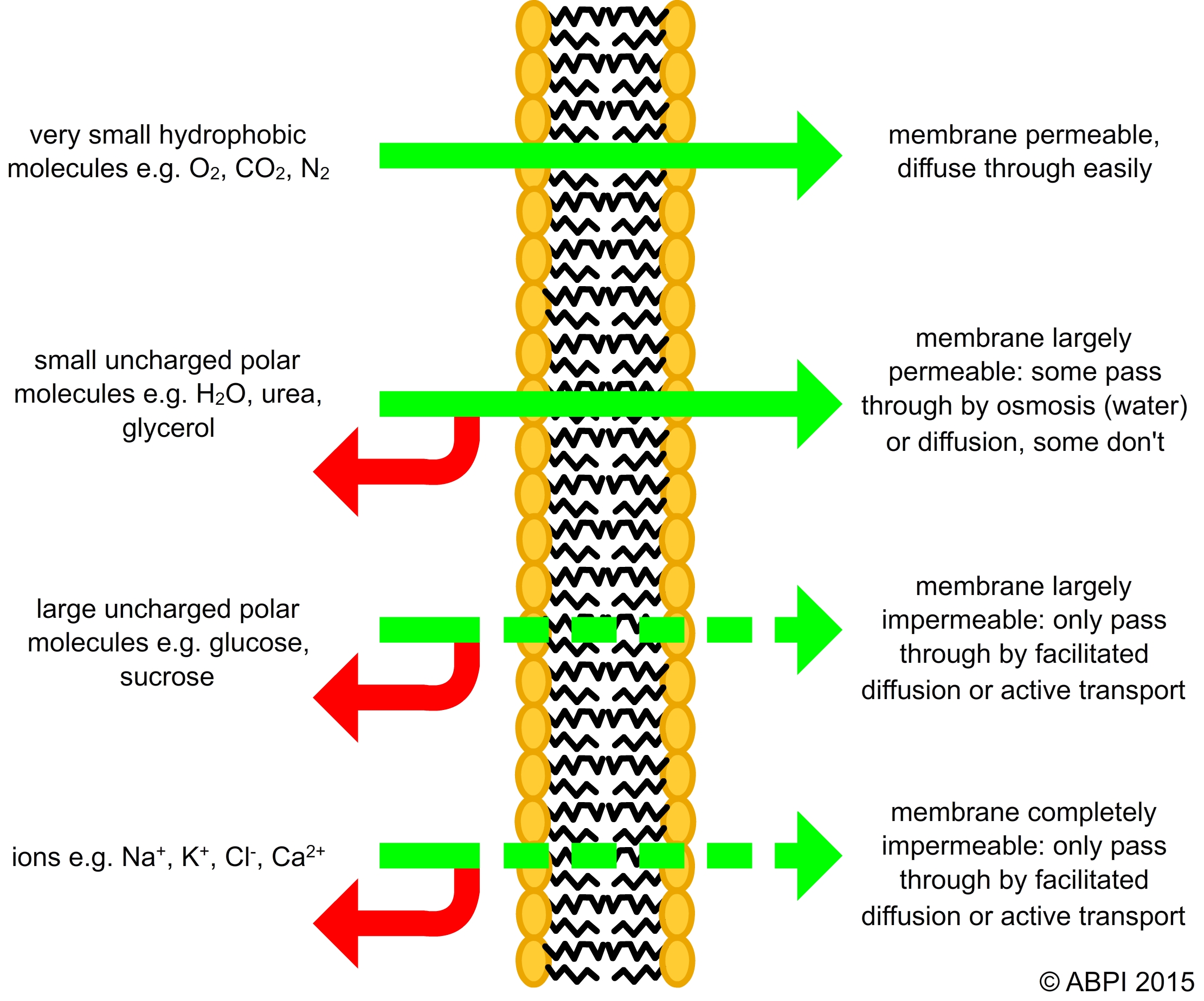 Everything that moves into and out of the cell has to pass through the cell membrane. Cell membranes are partially permeable. This means some substances pass through the membrane relatively easily but others cannot move through it without the input of energy from ATP. The properties of molecules affect how easily they are transported.