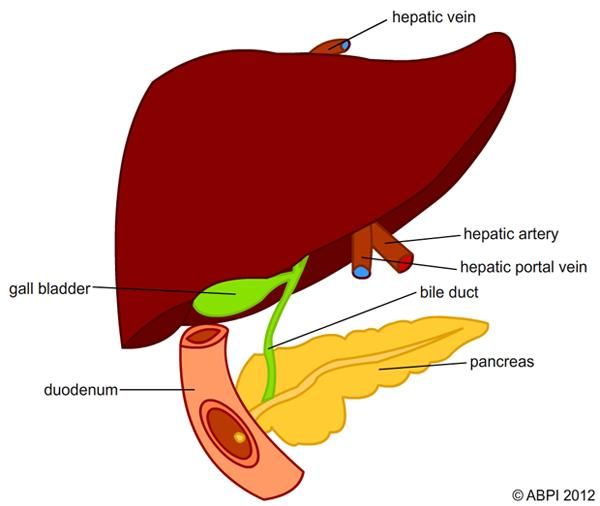 Bile is made in the liver, stored in the gallbladder and released through the bile duct when it is needed