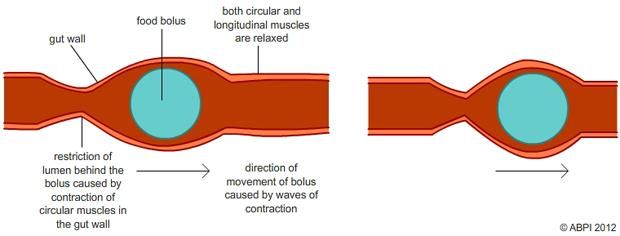 Peristalsis is also involved in the mixing of the food with the digestive juices and in breaking it down from lumps into a thick paste which is then squeezed through the body. This increases the surface area of food available to the digestive enzymes.