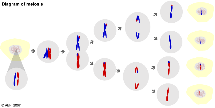 Meiosis is the process by which new cells with half the usual number of chromosomes are produced. In humans the full complement of 46 chromosomes is called the diploid number. Meiosis produces cells with 23 chromosomes, known as the haploid number, and these are the gametes, i.e. sperms for males and ova for females.