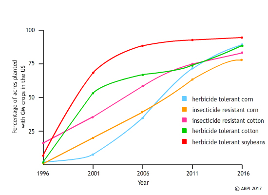 The percentage of GM crops grown in the US has rocketed since 1996.