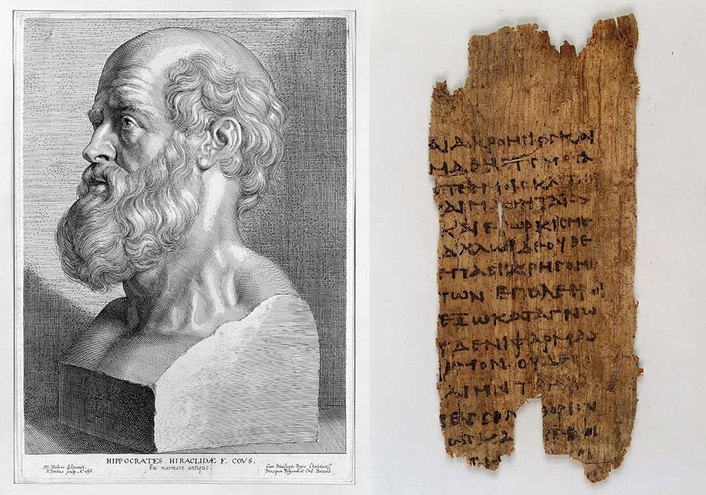 (right) Hippocrates – famed for the Hippocratic oath, (left) A fragment of the Hippocratic oath