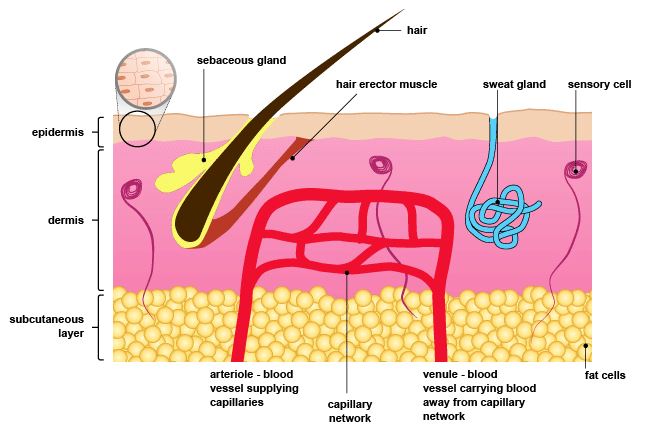 The skin has three main layers - the epidermis, the dermis and the subcutaneous layer.