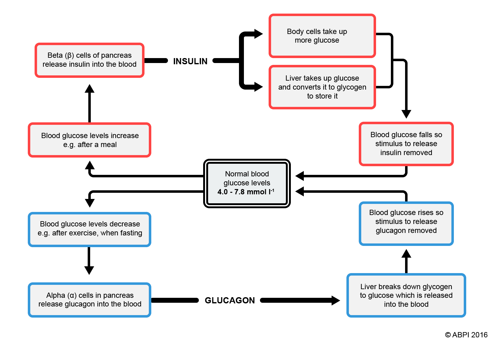 The interaction of the hormones insulin and glucagon are key to the maintenance of the blood sugar levels of the body within normal limits