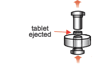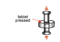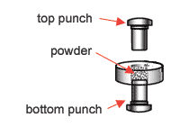 Each tablet is made by pressing the granules inside a die made of hardened steel. The die is a disc shape with a hole cut through its centre. The powder is compressed in the centre of the die by two hardened steel punches that fit into the top and bottom of the die.