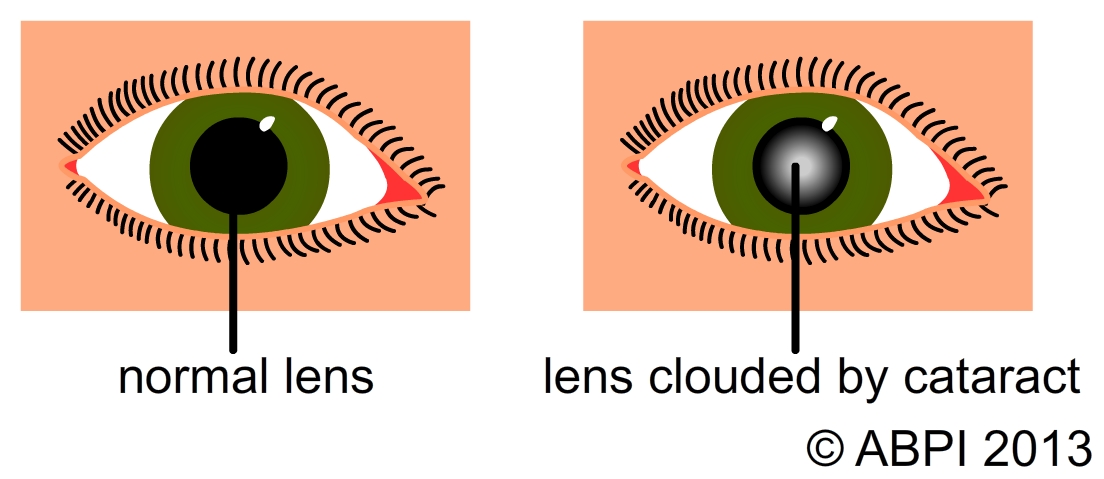 A cataract is a clouding of the lens. They often affect older people, and even older pets. Diabetes increases the risk of cataracts. They can develop in one or both eyes. As the lens gets cloudy the vision becomes blurred and colour vision is lost. Eventually the person will become completely blind in the affected eye.